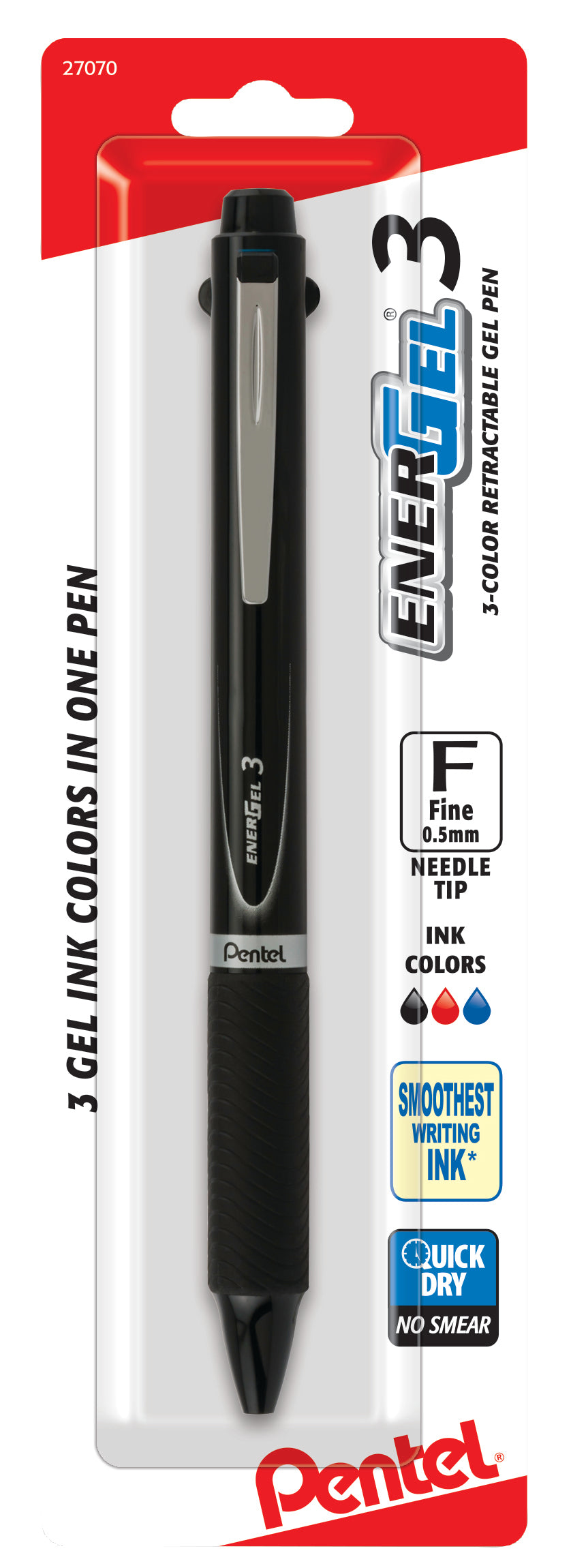 The Pentel® EnerGel® 3 multi-color gel pen offers three ink colors (black, red and blue) in a single, stylish pen. High-performance ink technology combines the best qualities of liquid and gel ink for a super-smooth writing experience. Fast-drying ink is great for left handers - no smears, no smudges, no globs. Sleek barrel design feels great in your hand and features a latex-free grip. The .5mm needle tip writes fine lines. Refillable with (model#) ink refills. Each pen is backed by a Limited Lifetime Warranty.