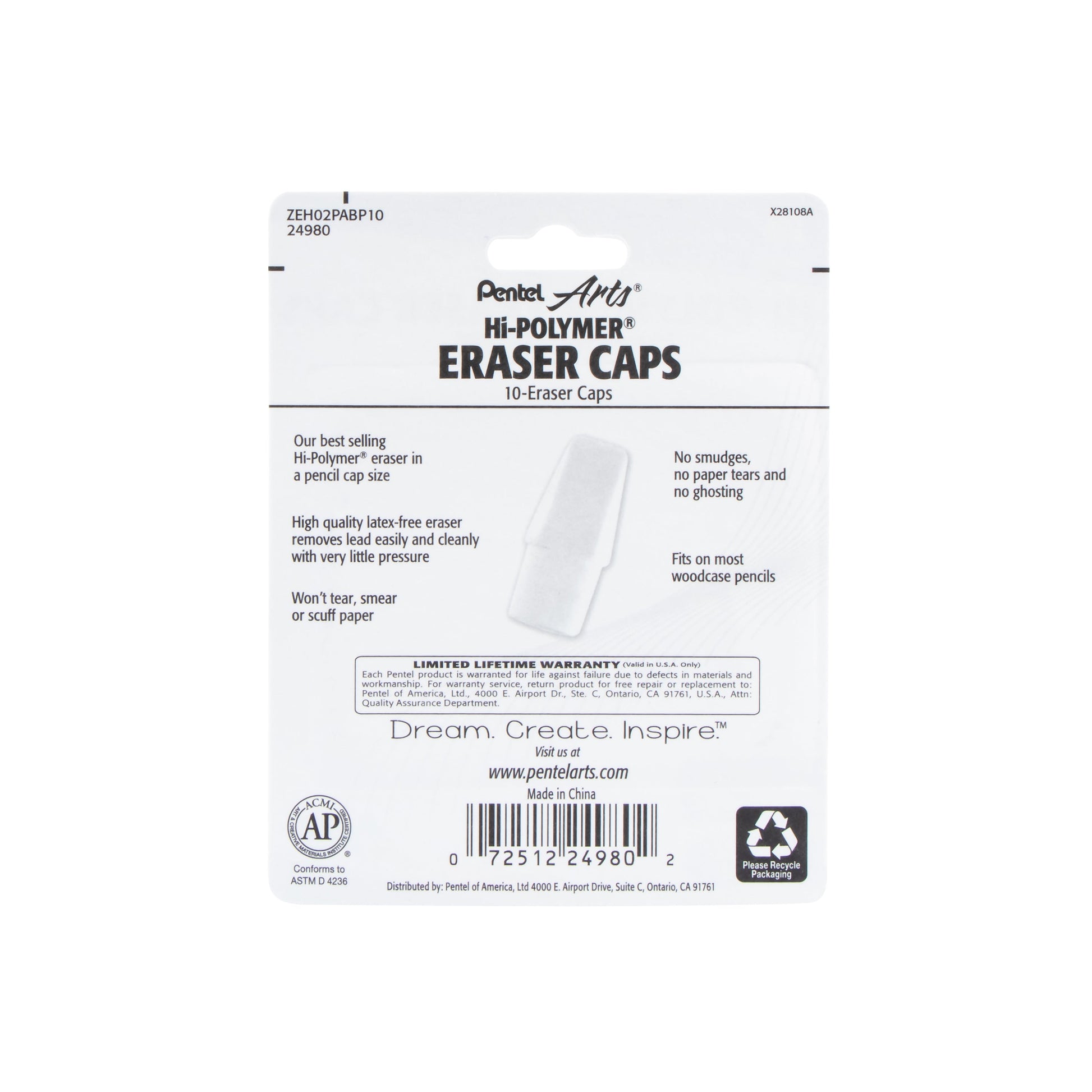 The Pentel® ZEH02 is our best-selling Hi-Polymer® eraser cap. High-quality latex-free eraser removes lead easily and cleanly with very little pressure. Fits most woodcase pencils.